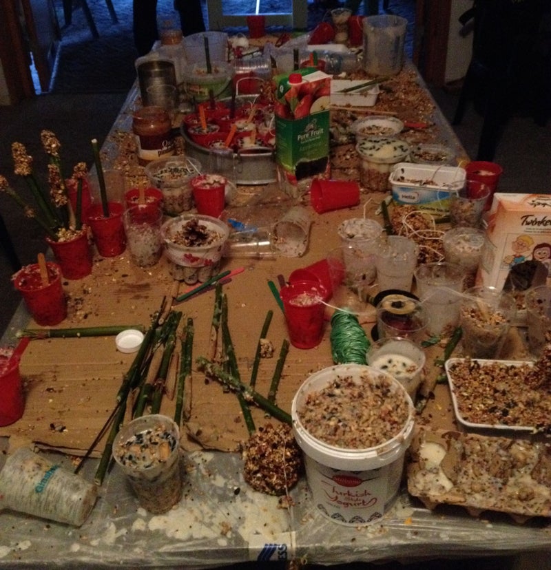 Woensdagmiddag 29 november 2017 is er hard gewerkt en geknoeid met vogelzaad, vet, pindakaas en dennenappels.