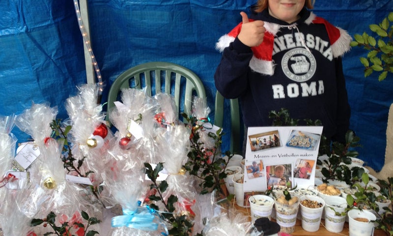 27 kinderen die lekker knoeien met vet, zaadjes en pindakaas. Daarna nog een lekkere pannenkoek. Op naar de kerstmarkt. De kinderen mogen bij ons zelf achter de kraam kruipen om te verkopen.